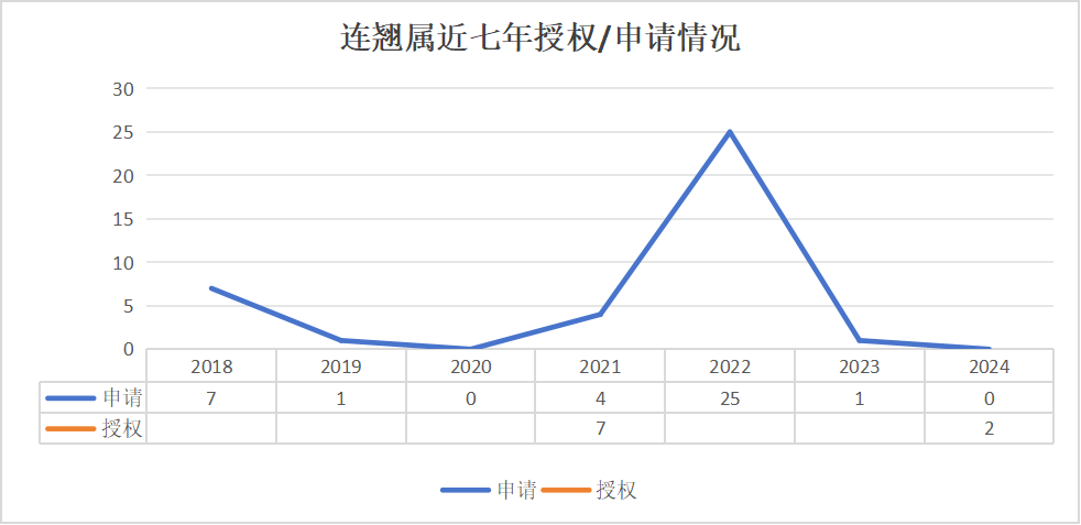 自 2018 年以来, 连翘属 近七年累计申请 38 件 ,集中在 2022 年 , 25 件,占比 65.8% ,其余年份申请量较低 , 年均不足 5 件。 累计授权 9 件 ,集中在 2021 年 , 7 件,占比 77.8% , 2024 年新增 2 件,其他年份授权极少 , 如 2020 、 2023 年无授权。整体授权率仅 23.7% ,且存在明显时间波动 , 如 2021 年授权量突增,可能与审查周期相关 。