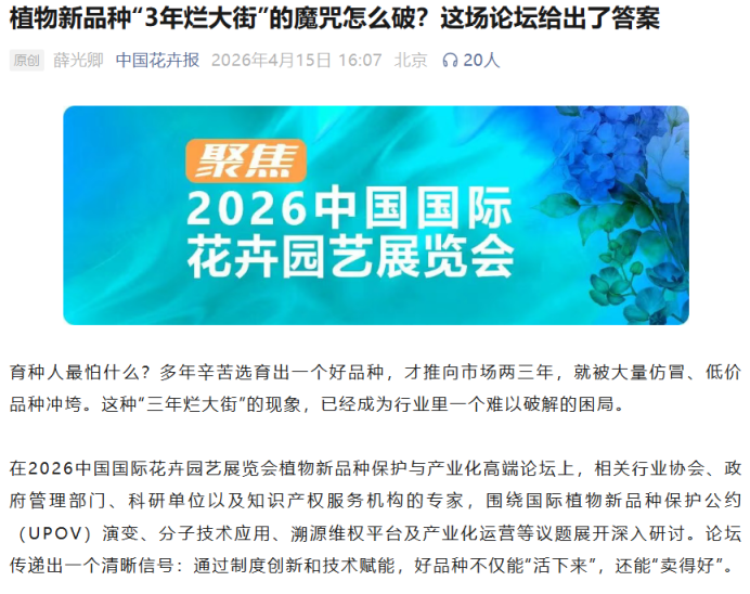报道标题: 《如何让品种生金,答案就在植物新品种保护与产业化论坛 | 2026 中国国际花展》