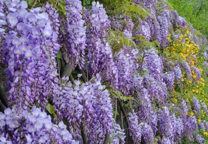 总状花序长25-40cm, 花蓝紫色 ,有清香,香气迷人。羽状复叶,叶片在秋天变为黄色。需要有较强硬的支撑物支撑,适宜覆盖凉亭、棚架、墙面花架之上。
