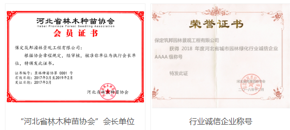 该公司相继被评为“全国十佳苗圃”、“河北省林业重点龙头企业”、“保定太行山绿色驿站”、“质量信得过苗木基地”、“河北省林木种苗协会”会长单位、“中国花卉报社”常务理事单位等等荣誉,并多次迎来国家、省、市各级领导的莅临指导。