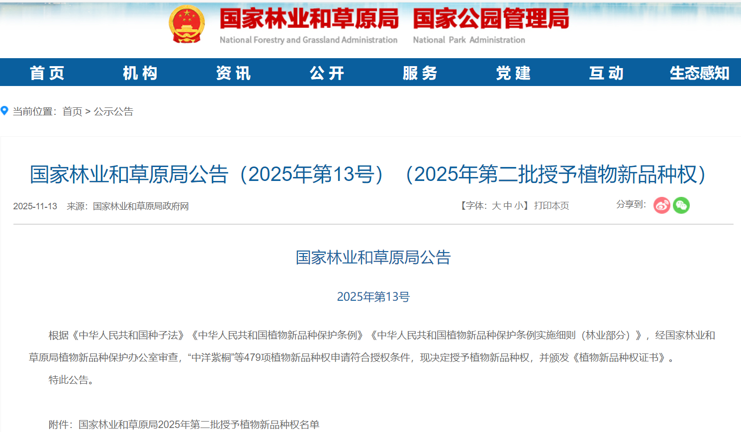 根据《中华人民共和国种子法》《中华人民共和国植物新品种保护条例》《中华人民共和国植物新品种保护条例实施细则(林业部分)》,经国家林业和草原局植物新品种保护办公室审查,“中洋紫桐”等479项植物新品种权申请符合授权条件,现决定授予植物新品种权,并颁发《植物新品种权证书》。特此公告。