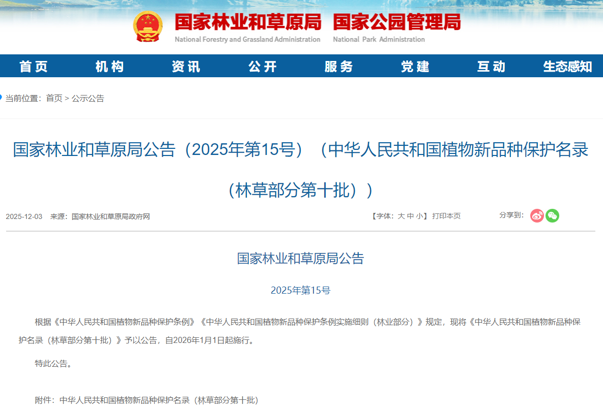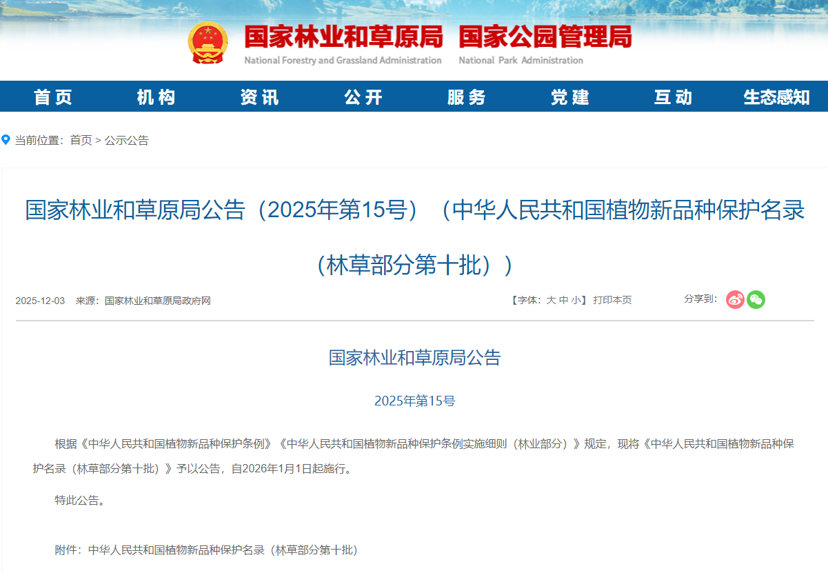 根据《中华人民共和国植物新品种保护条例》《中华人民共和国植物新品种保护条例实施细则(林业部分)》规定,现将《中华人民共和国植物新品种保护名录(林草部分第十批)》予以公告,自2026年1月1日起施行。