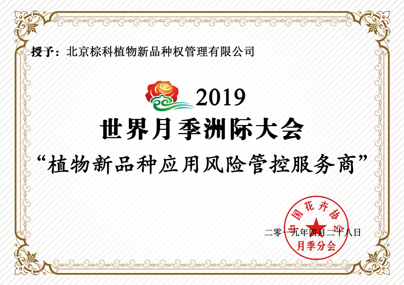 此外,我司还被授予了2019世界月季洲际大会“植物新品种应用风险管控服务商”!