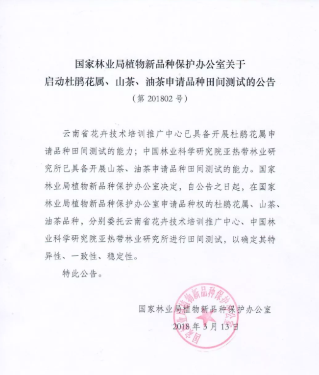 近日,国家林业和草原局植物新品种保护办公室发布文件:启动杜鹃花属、山茶、油茶申请品种田间实验的公告。