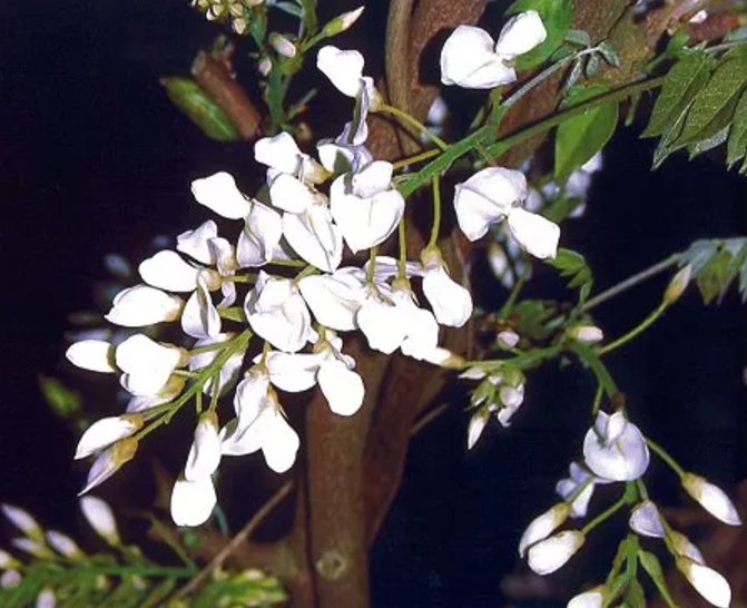 灿烂的 白色花序 ,长达到40-60cm,花朵香味强烈,香味类似碗豆,叶片浅绿色,秋季转为黄色,在日本它被认为是纯净和典雅的象征。