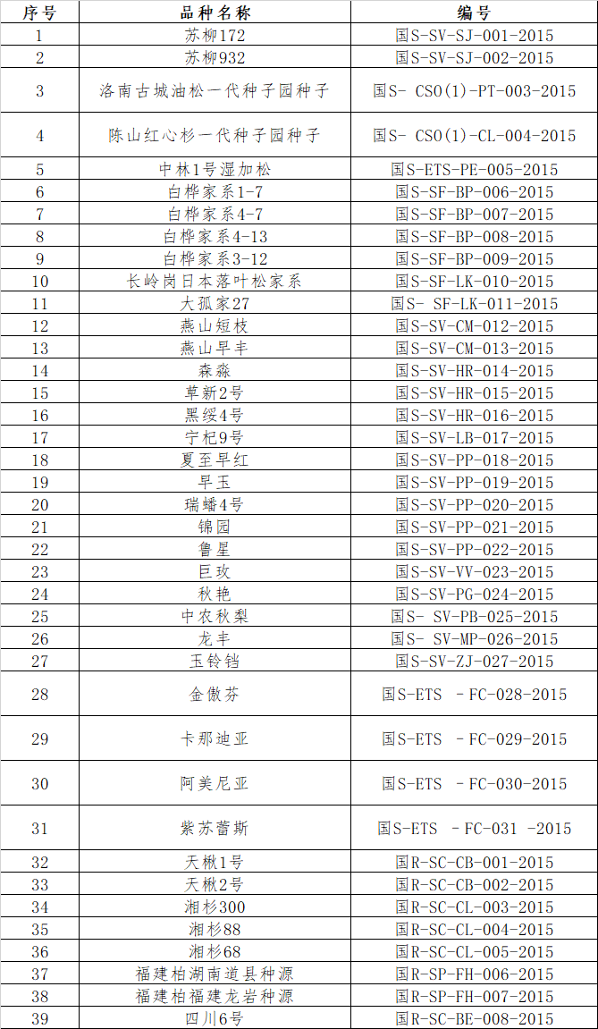 根据《中华人民共和国种子法》第十九条的规定,现将由国家林业局林木品种审定委员会审定通过的苏柳172等31个品种和认定通过的天楸1号等8个品种作为林木良种(详见附件)予以公告。自公告发布之日起,这些品种在林业生产中可以作为林木良种使用,并在本公告规定的适宜种植范围内推广。