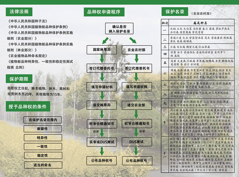 植物新品种保护的范围: 我国植物新品种保护工作是由国家林业局和农业部两个部门来进行的。根据两部门在植物新品种保护工作上的分工, 国家林草局 负责林木、竹、木质藤本、木本观赏植物(包括木本花卉)、果树(干果部分)及木本油料、饮料、调料、木本药材等植物新品种保护工作; 农业农村部 负责农作物、蔬菜、水果、草本花卉等植物新品种保护工作(见附件)。