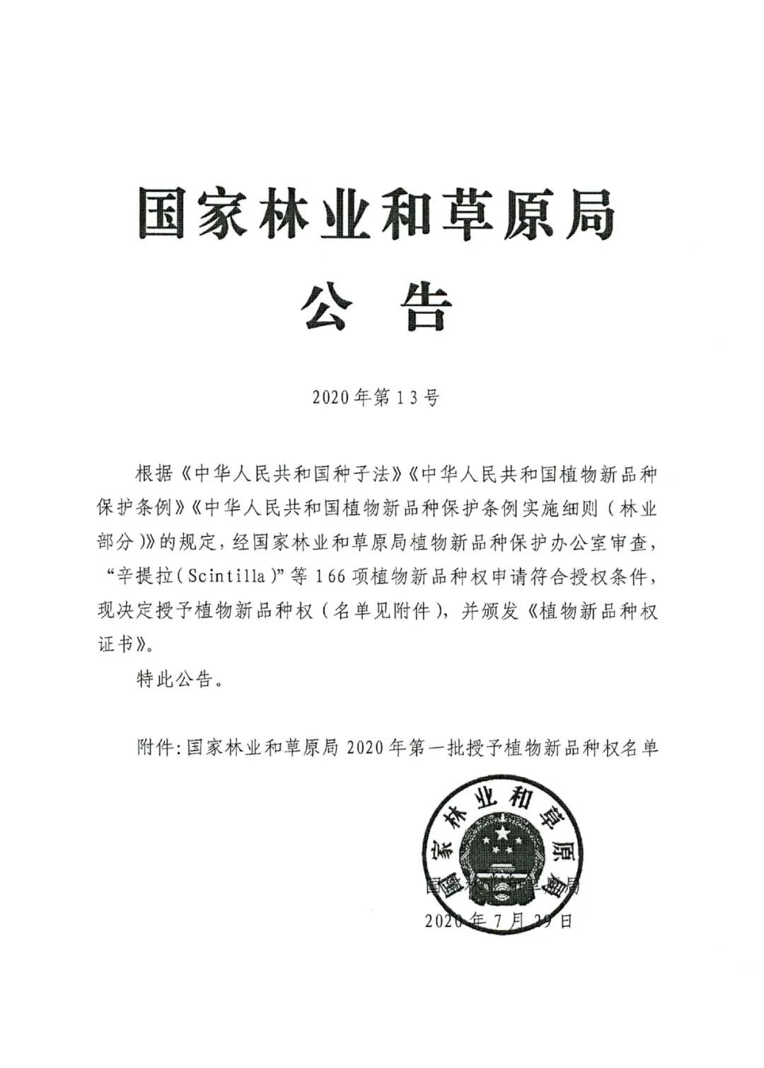 根据《中华人民共和国种子法》和《中华人民共和国植物新品种保护条例》《中华人民共和国植物新品种保护条例实施细则(林业部分)》的规定,经国家林业和草原局植物新品种保护办公室审查,“辛提拉(Scintilla)”等166项植物新品种权申请符合授权条件,现决定授予植物新品种权,并颁发《植物新品种权证书》。