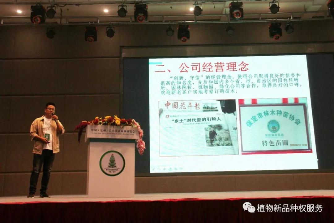 来自北京林业大学、北京农学院、河南四季春园林艺术工程有限公司、石家庄市藁城区绿都 市 政 园林工程有限公司、保定筑邦园林景观工程有限公司以及河北燕青农业科技有限公司等单位分别推介了他们的拳头产品。北京棕科植物新品种权管理有限公司总经理骆会欣结合”植物新品种保护与产业化国家创新联盟“成员单位的育种成果以及植物新优品种平台建设,重点对观赏植物、生态修复以及经济果树类等具发展潜力的新优品种进行了推介。