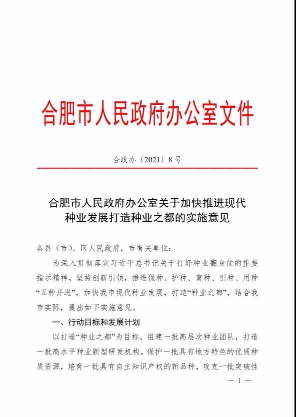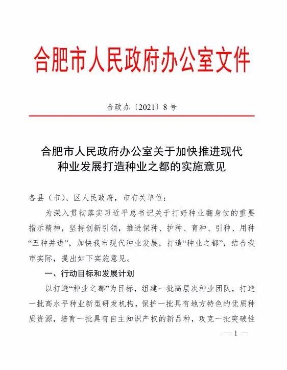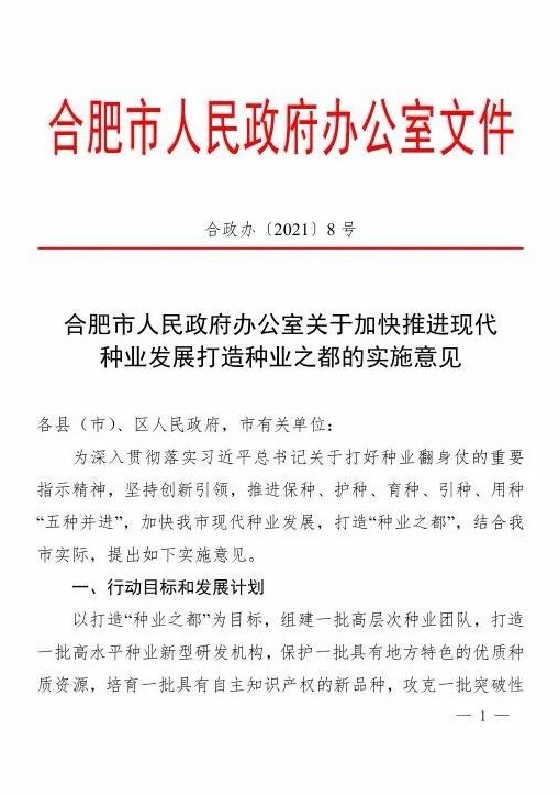 3月19日,合肥市政府办公室印发《关于加快推进现代种业发展打造种业之都的实施意见》,目标是种业销售额突破100亿,打造中国“种业之都”,推进保种、护种、育种、引种、用种“五种并进”,并且在品种保护、资源利用、人才引进、用地保障、组织领导等方面全方位予以强力支持。 该意见自2021年5月1日起施行,有效期5年。