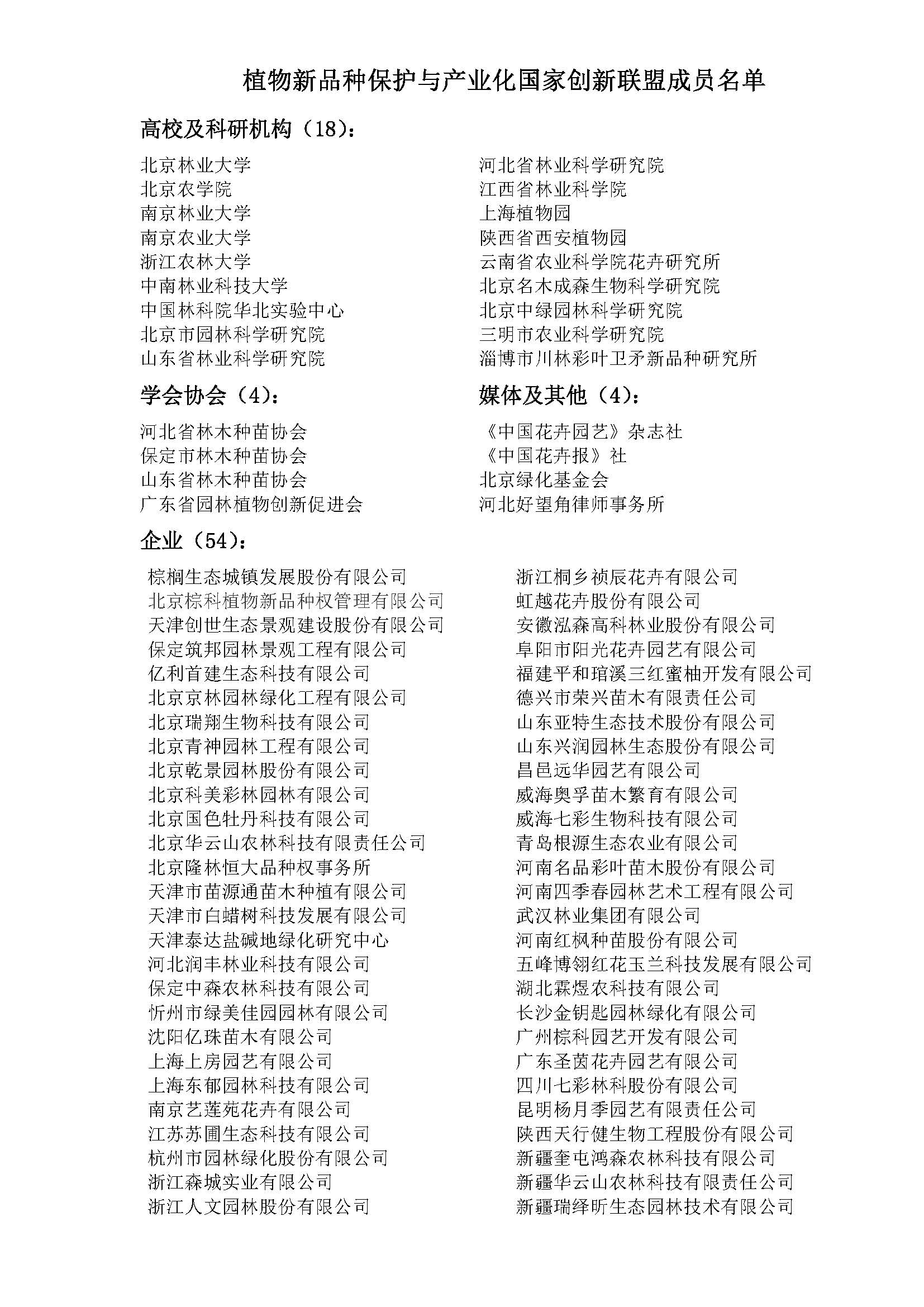 “植物新品种保护与产业化国家创新联盟”成员单位有80家,涉及20多个省份的企事业单位,包含6家高校,12家科研院所,54家企业,4家学会协会,4家行业媒体机构等,联盟成员名单如下: