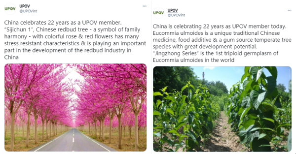 2021年4月23日是中国加入国际植物新品种保护联盟(UPOV)22周年纪念日,也恰逢“全国知识产权宣传周”。为在国际上宣传我国植物新品种保护成就,经国家林业和草原局植物新品种保护办公室推荐,国际植物新品种保护联盟(UPOV)在其领英、推特等社交媒体上发布4个中国林草植物新品种及其转化应用情况,这是UPOV社交媒体平台首次发布中国林草植物新品种,也是庆祝中国加入UPOV22周年活动之一。这4个植物新品种是‘盛春8号’杜鹃、‘美人榆’(俗称金叶榆)、‘京仲系列’杜仲和‘四季春1号’紫荆。