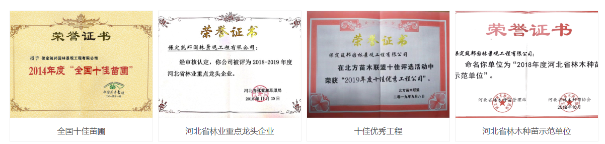 该公司相继被评为“全国十佳苗圃”、“河北省林业重点龙头企业”、“保定太行山绿色驿站”、“质量信得过苗木基地”、“河北省林木种苗协会”会长单位、“中国花卉报社”常务理事单位等等荣誉,并多次迎来国家、省、市各级领导的莅临指导。