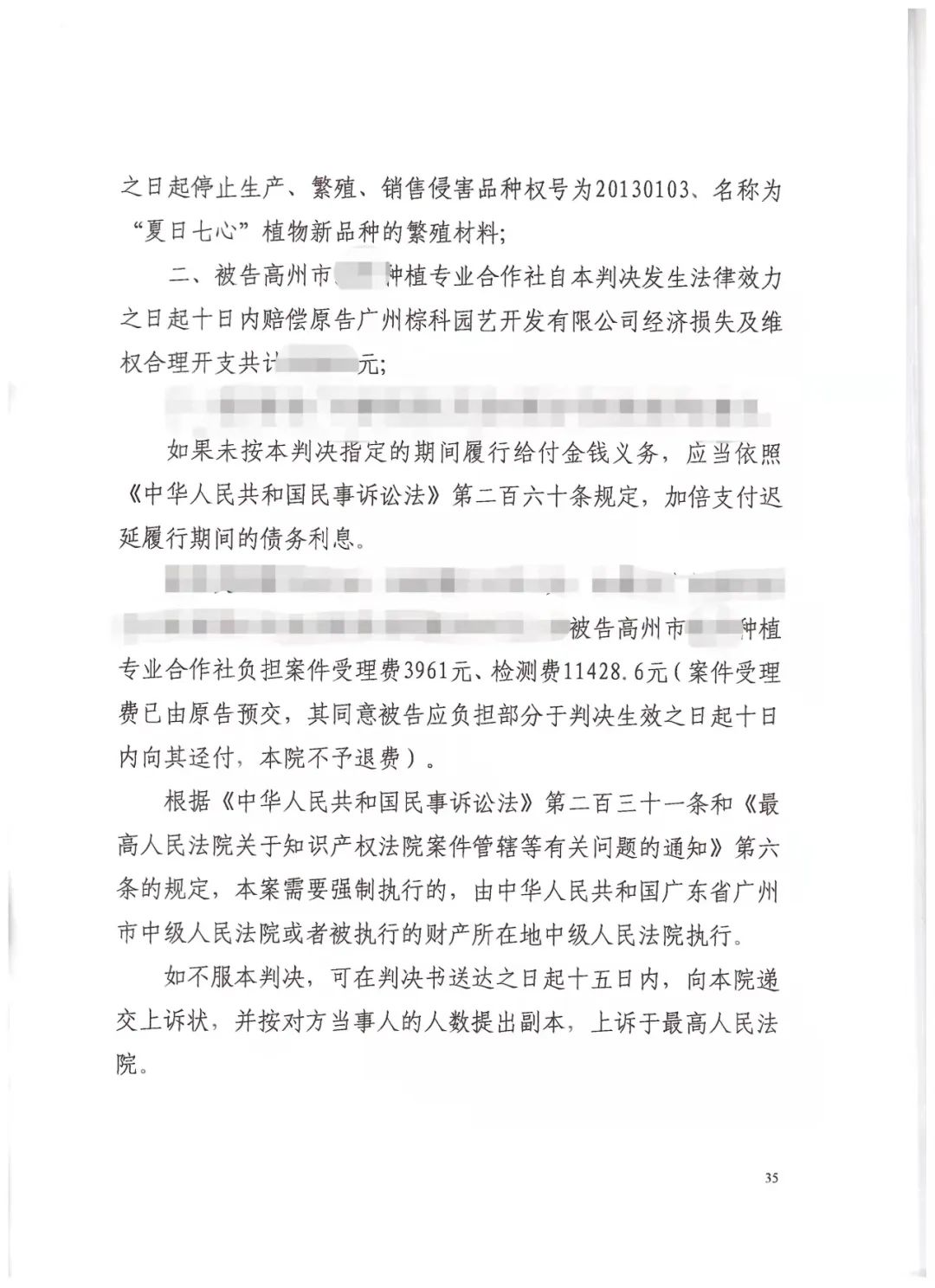 1、侵权方自相关案件判决发生法律效力之日起 停止生产、繁殖、销售 ‘夏日七心’、‘夏梦小旋’植物新品种。