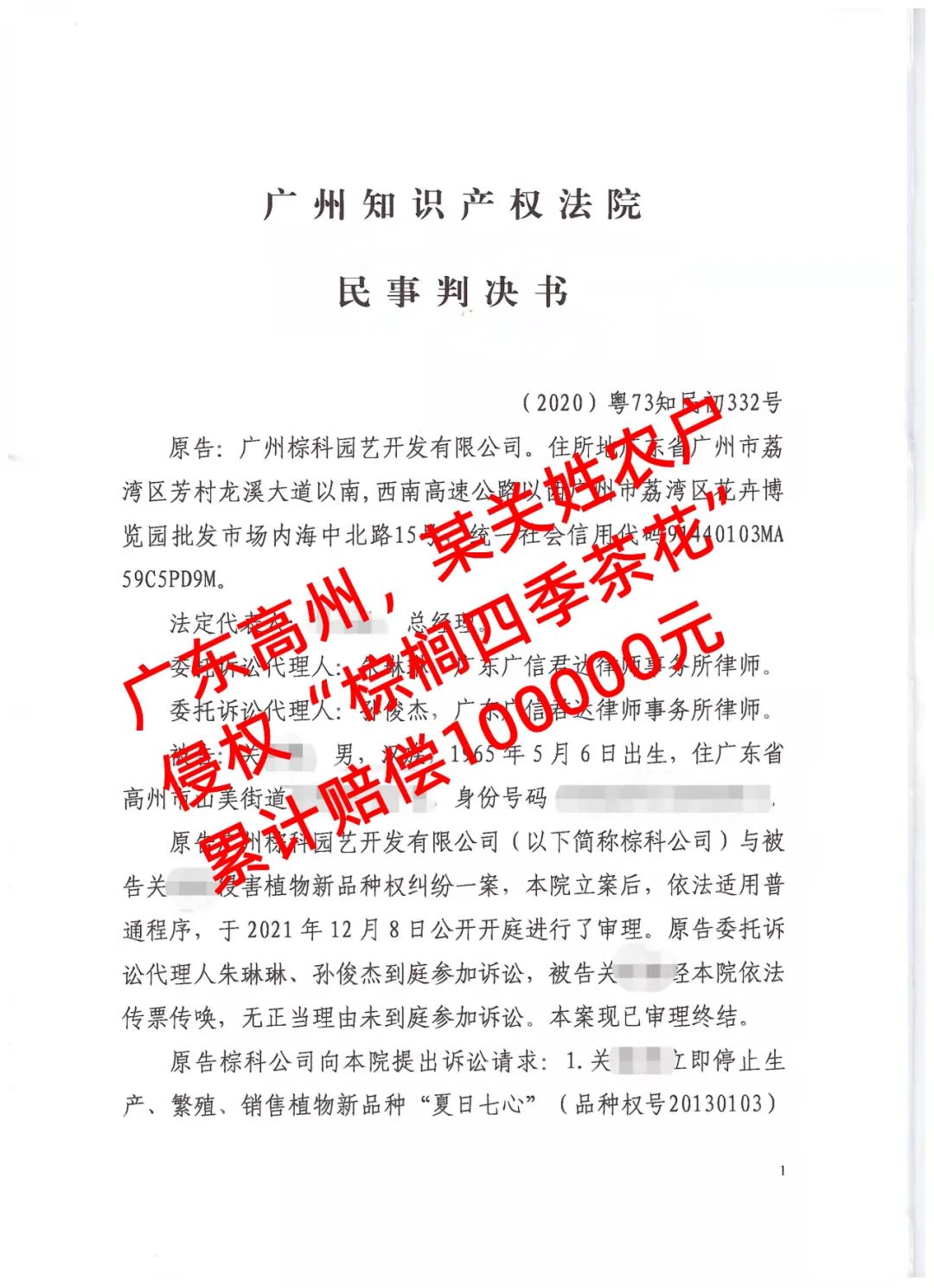 “棕榈四季茶花”新品种维权初战告捷, 两侵权户被累计判决赔偿权利人1450000元!