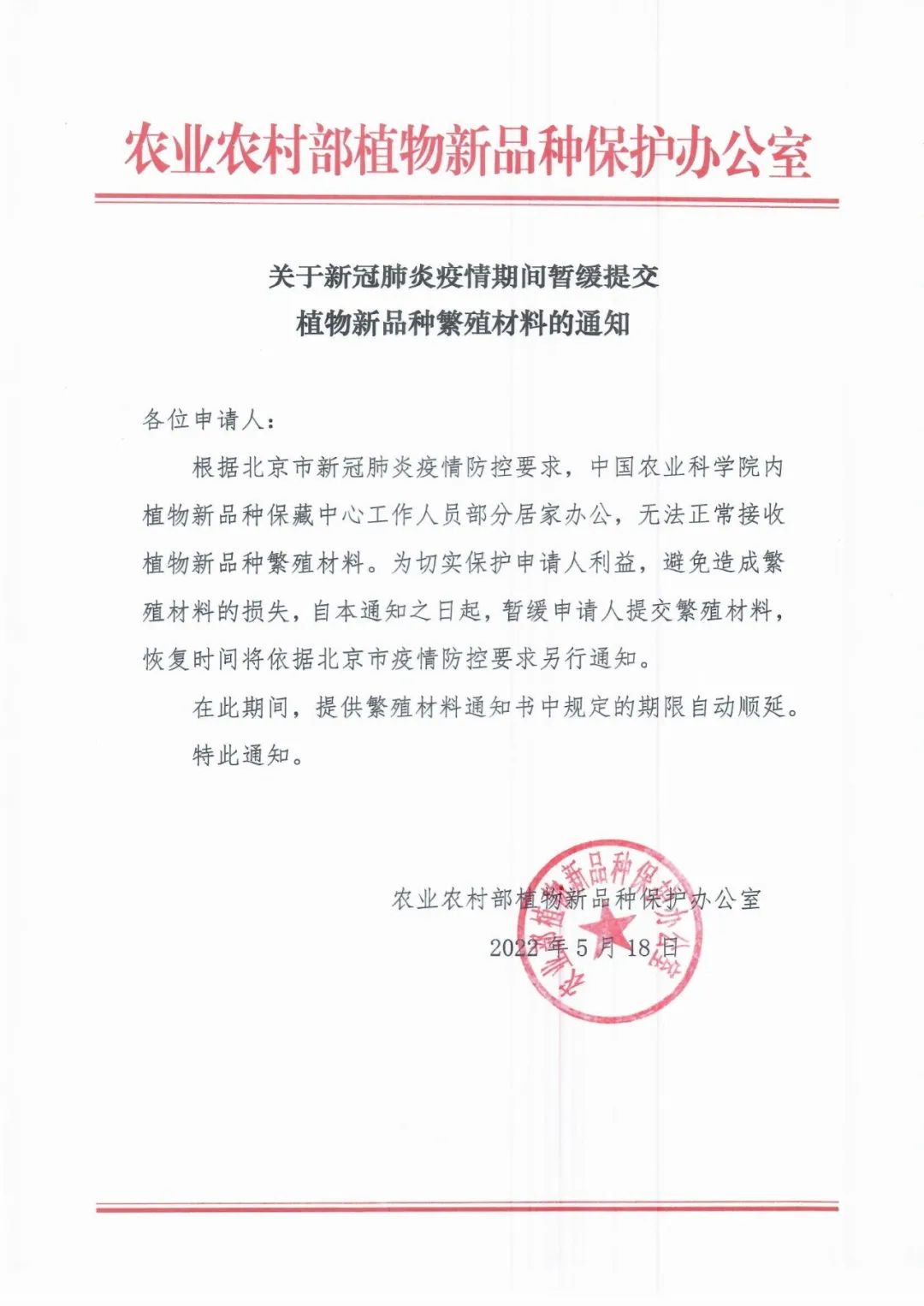 18日,农业农村部植物新品种保护办公室发布通知,受新冠肺炎疫情影响,自本通知之日起,暂缓申请人提交繁殖材料,恢复时间将依据北京市疫情防控要求另行通知。在此期间,提供繁殖材料通知书中规定的期限自动顺延。