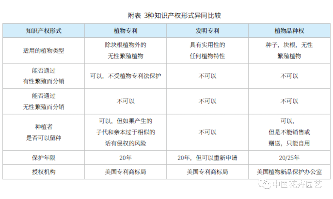 我们用表格的方式对美国植物保护的3种方法进行了对比。可以总结出,在美国,如果需要保护某个植物品种,可以根据这个品种最主要的繁殖方式来选择申请植物专利或者植物品种权。无性繁殖植物品种,可以选择植物专利或者植物品种权。其他的植物品种只能选择植物品种权。而如果是需要保护植物的某个有价值的特性,或者改变某种植物特性的方法,就可以通过申请植物发明专利的方法来实现。