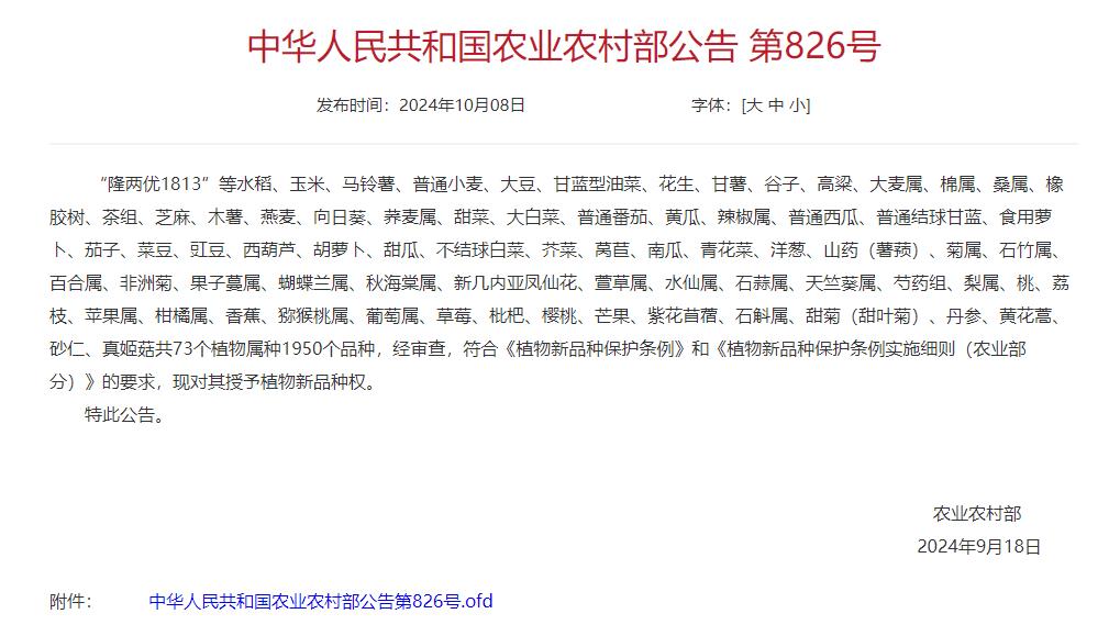 2024年9月18日,中华人民共和国农业农村部公告第826号, “隆两优1813”等水稻、玉米、马铃薯、普通小麦、大豆、甘蓝型油菜、花生、甘薯、谷子、高粱、大麦属、棉属、桑属、橡胶树、茶组、芝麻、木薯、燕麦、向日葵、荞麦属、甜菜、大白菜、普通番茄、黄瓜、辣椒属、普通西瓜、普通结球甘蓝、食用萝卜、茄子、菜豆、豇豆、西葫芦、胡萝卜、甜瓜、不结球白菜、芥菜、莴苣、南瓜、青花菜、洋葱、山药(薯蓣)、菊属、石竹属、百合属、非洲菊、果子蔓属、蝴蝶兰属、秋海棠属、新几内亚凤仙花、萱草属、水仙属、石蒜属、天竺葵属、芍药组、梨属、桃、荔枝、苹果属、柑橘属、香蕉、猕猴桃属、葡萄属、草莓、枇杷、樱桃、芒果、紫花苜蓿、石斛属、甜菊(甜叶菊)、丹参、黄花蒿、砂仁、真姬菇共73个植物属种1950个品种,经审查,符合《植物新品种保护条例》和《植物新品种保护条例实施细则(农业部分)》的要求,对其授予植物新品种权。