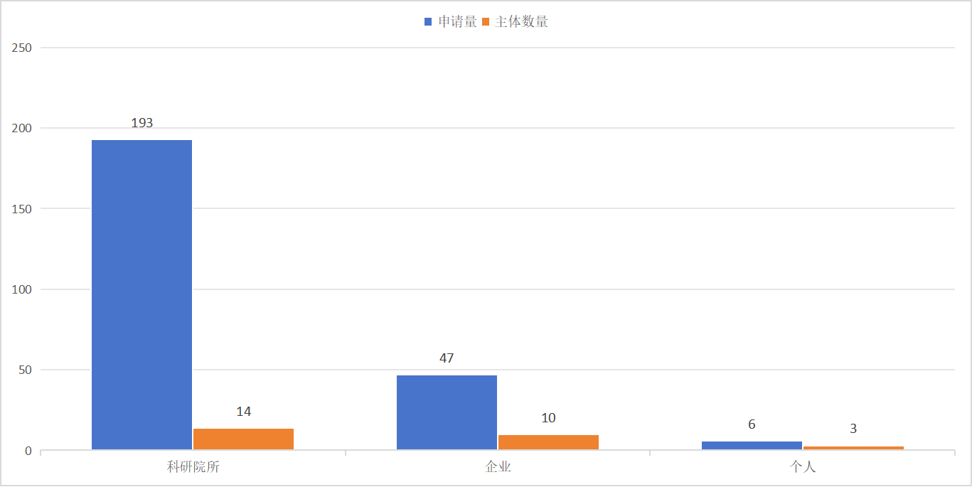 在申请主体方面,科研院所在朱顶红品种创新方面占据主导地位。全国共有14家科研院所进行了朱顶红新品种的申请,申请数量达193件,占总申请量的77.2%,其中仅广东省农业科学院环境园艺研究所 一家就高达159件。