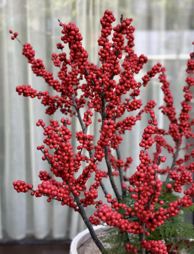 北美冬青,是冬青科冬青属的多年生灌木,原产于美国东北部,能承受约-30°C的低温耐寒。其独特之处在于冬天会落叶,当叶片凋零后,枝头上便挂满了密密麻麻鲜红的果实,成为冬日里一道喜庆的风景线。