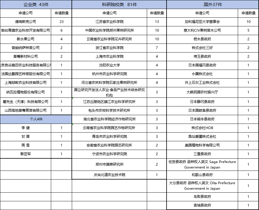 国外机构活跃(37件,9.9%):美国加州大学(10件)、意大利CIV公司(5件)为国际主力,日本地方政府(枥木、埼玉等)分散布局。个人授权的新品种仅4件,与国内企业同处弱势。
