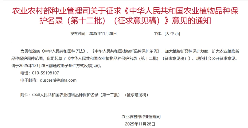 为贯彻落实《中华人民共和国种子法》、《中华人民共和国植物新品种保护条例》,加大植物新品种保护力度,扩大农业植物新品种保护属种范围,我司起草了《中华人民共和国农业植物品种保护名录(第十二批)(征求意见稿)》。现向社会公开征求意见。请于2025年12月28日前通过电子邮件方式反馈我司。