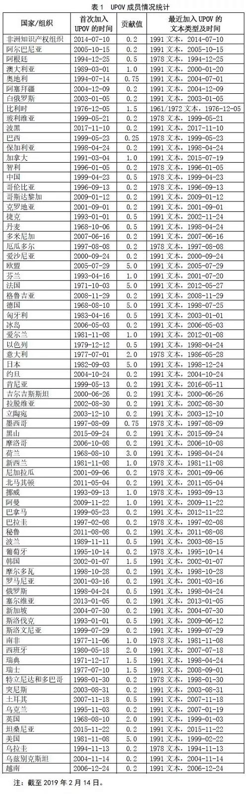 国际植物新品种保护联盟(UPOV)网站报道,截至2019年2月14日UPOV成员共有75个,其中加入UPOV 1991文本的国家/组织57个,加入UPOV 1978文本的国家17个,加入UPOV 1961/1972文本的国家1个(表1)。在UPOV 75个成员中,国家73个,组织2个(非洲知识产权组织和欧盟)。