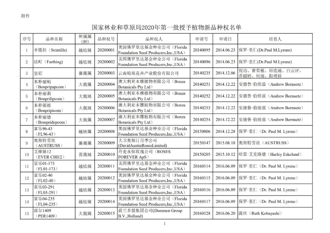 (附件:国家林业和草原局2020年第一批授予植物新品种权名单)