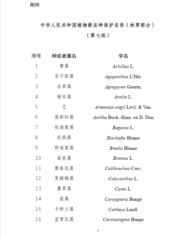 根据《中华人民共和国植物新品种保护条例》《中华人民共和国植物新品种保护条例实施细则(林业部分)》的规定,现将《中华人民共和国植物新品种保护名录(林草部分)(第七批)》(见附件)予以公布,自2021年1月1日起施行。