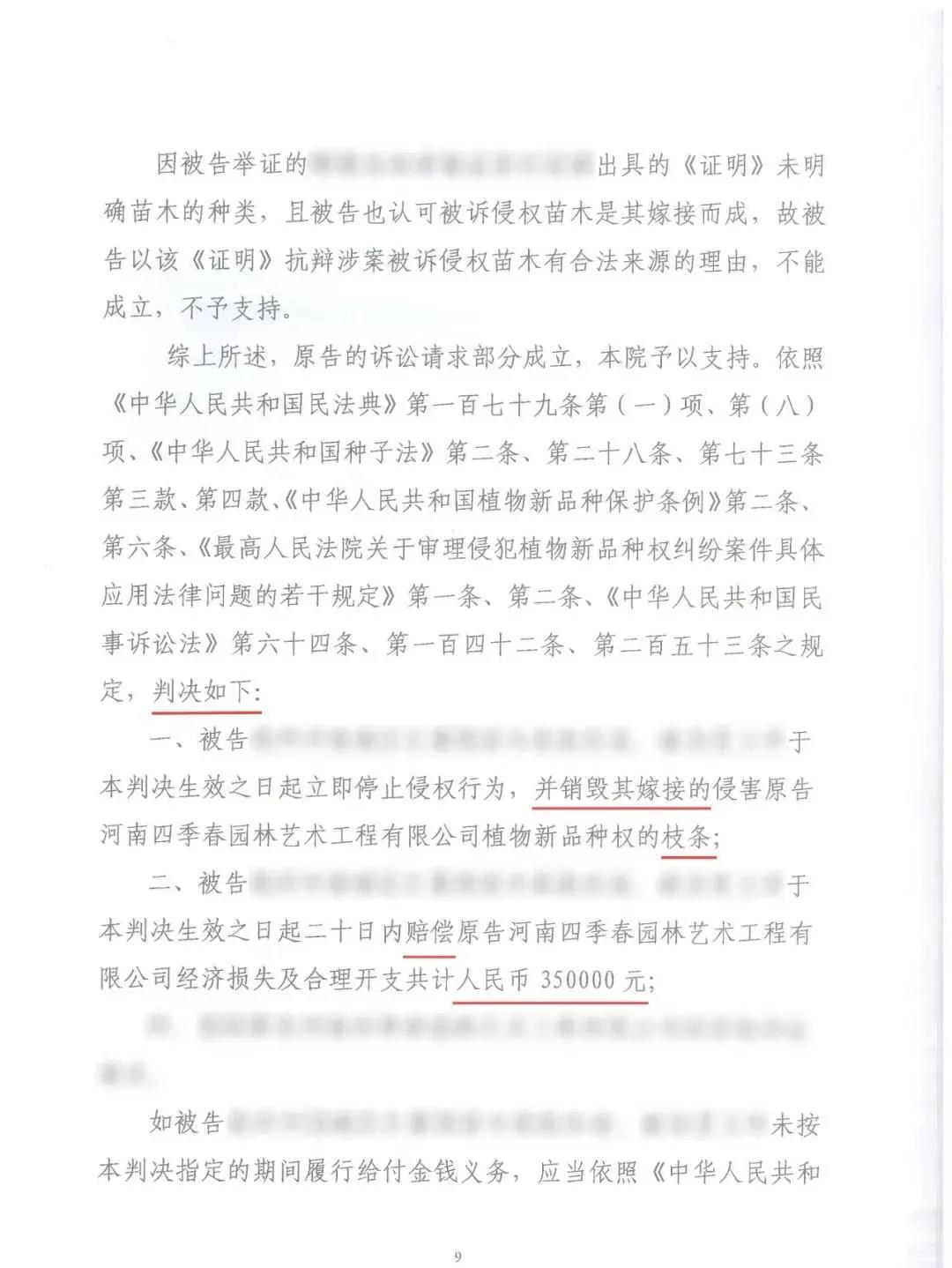 侵权方于判决生效之日起二十日内赔偿四季春园林经济损失及合理开支共计人民币35万元;
