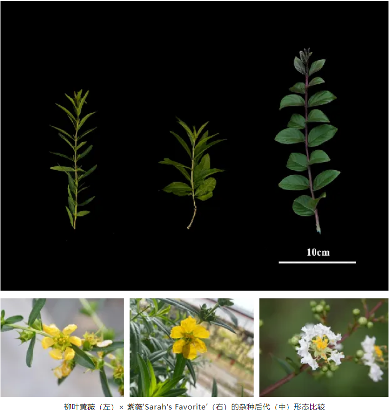 柳叶黄薇(左)× 紫薇‘Sarah's Favorite’(右)的杂种后代(中)形态比较