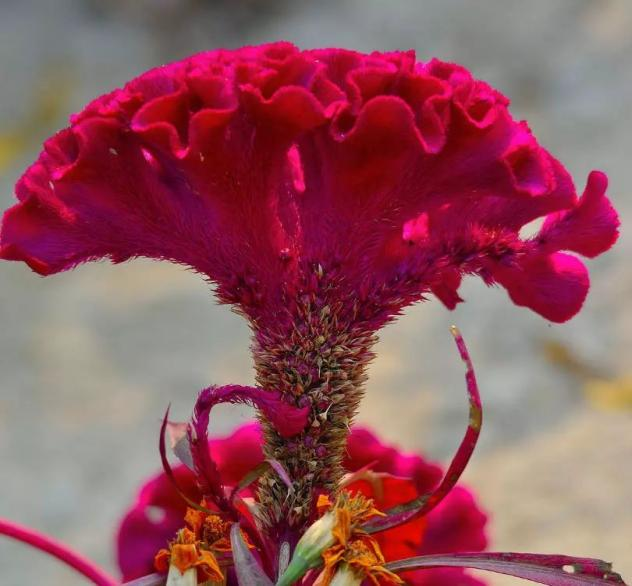 鸡冠花最引人注目之处在于其顶上的“鸡冠”,“鸡冠”并非实质意义上的一朵花,而是它的肉质花序,花序的中下部集聚有由许多干膜状小花,形成花冠,常见多为红色,也有黄、紫、白等色。