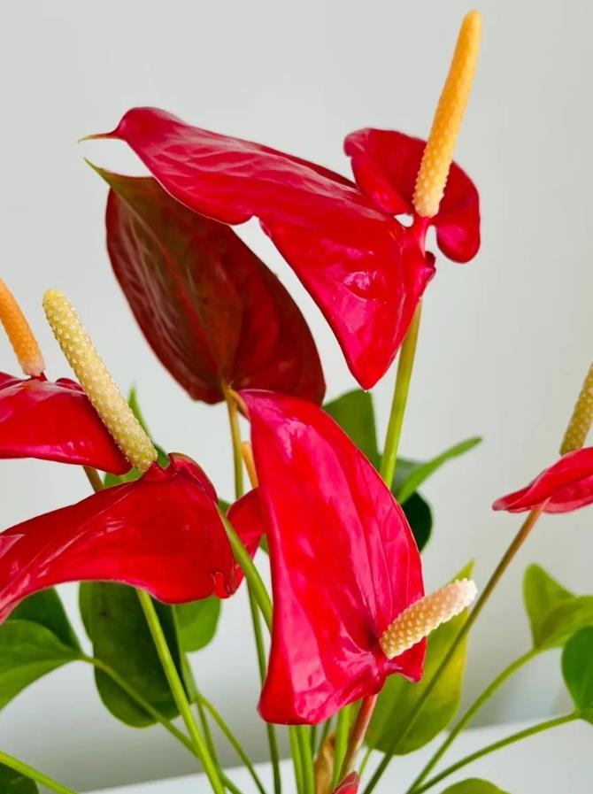 花烛( Anthurium ),凭借其革质心形叶片与蜡质佛焰苞的独特形态,被誉为"植物界的红宝石"。作为天南星科最具经济价值的属种,其肉穗花序与佛焰苞形成的立体几何结构,展现出热带植物特有的进化智慧。