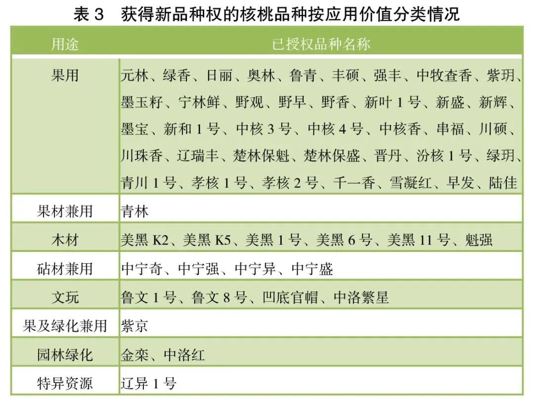 截至2021年,在获得新品种授权的品种中,有9个新品种已通过省级林木新品种审定,分别为元林、中宁强、宁林鲜、中洛繁星、中核4号、中核香、辽瑞丰、绿玥、孝核1号;有6个品种通过省级林木新品种认定,分别为紫玥、汾核1号、青川1号、孝核2号、雪凝红、早发。按照主要应用价值分类(表3),果用品种38个,果材兼用品种1个,材用品种6个,砧材兼用品种4个,文玩品种4个,果及绿化兼用品种1个,园林绿化品种2个,特异资源1个。