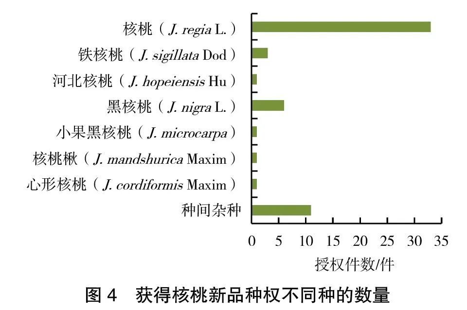 截至2021年,核桃种(Juglans regia L.)中的33个新品种获得了新品种授权,占授权核桃新品种总数的57.9%;其次是种间杂交种,有11个核桃品种获得了新品种授权,占比为19.3%;黑核桃种(J. nigra L.)中的6个新品种获得新品种授权,占比为10.5%(图4)。