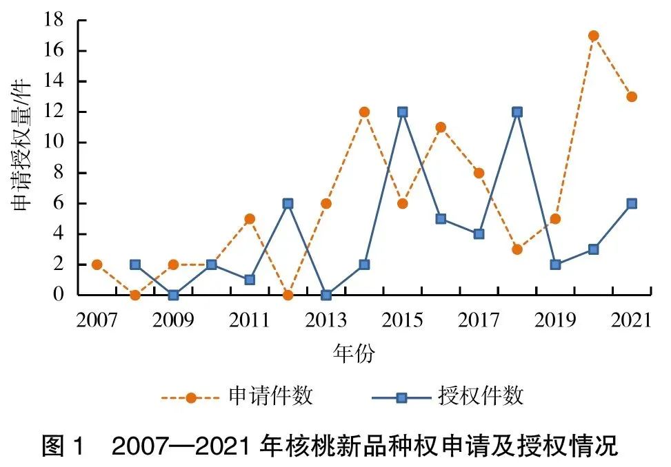 2000年,国家林业和草原局公布,核桃属入选中华人民共和国植物新品种保护名录(林业部分)(第二批)。据统计,我国最早申请核桃新品种权的单位是山东省林业科学研究院,申请品种为元林和青林,申请日期为2007年11月16日,授权日期为2008年12月2日。如图1所示,2007—2021年,核桃新品种权申请件数92件,平均年申请6.1件;2008—2021年共授核桃新品种权57件,平均年授权4.1件,授权率为72.2%。