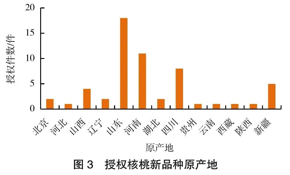 对已授权核桃新品种的原产地情况进行分析,发现有13个省(直辖市、自治区)对本地培育或发现的核桃资源进行了保护,山东省有18个核桃新品种获得新品种权(图3),占目前所有授权核桃新品种总数的31.6%;其次是河南省,有11个核桃新品种获得新品种权,占授权核桃新品种总数的19.3%;第三是四川省,有8个核桃新品种获得新品种权,占授权核桃新品种总数的14.0%。
