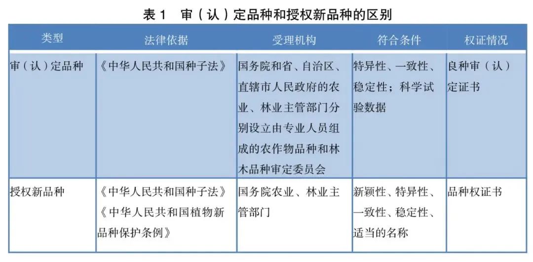 《中华人民共和国种子法》还规定,国家实行植物新品种保护制度,对国家植物品种保护名录内经过人工选育或者发现的野生植物加以改良,具备新颖性、特异性、一致性、稳定性和适当命名的植物品种,由国务院农业、林业主管部门授予植物新品种权,保护植物新品种权所有人的合法权益。实际上,《中华人民共和国植物新品种保护条例》于1997年就已颁布实施,对授予品种权的植物新品种应当具备新颖性、特异性、一致性和稳定性以及名称进行了明确的规定。新颖性是指申请品种权的植物新品种在申请日前该品种繁殖材料未被销售,或者经育种者许可,在中国境内销售该品种繁殖材料未超过1年;在中国境外销售藤本植物、林木、果树和观赏树木品种繁殖材料未超过6年,销售其他植物品种繁殖材料未超过4年。表1简要列举了审(认)定品种和授权新品种的区别。